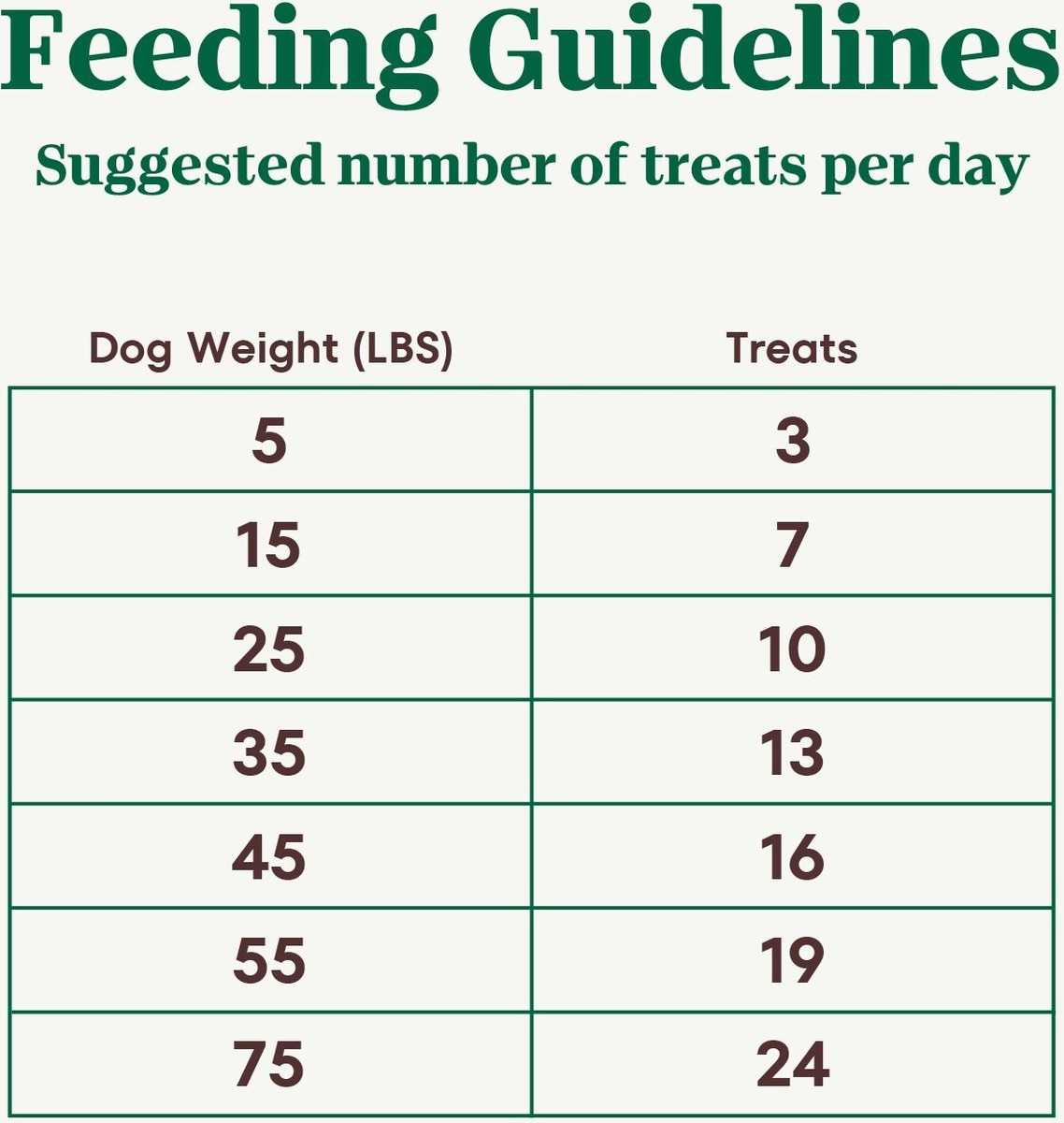 Feed the suggested number of treats per day per the packaging label throughout the day as a complement to your dog’s normal diet. Keep treats to 10% or less of your dog’s recommended daily caloric intake to avoid unwanted weight gain.