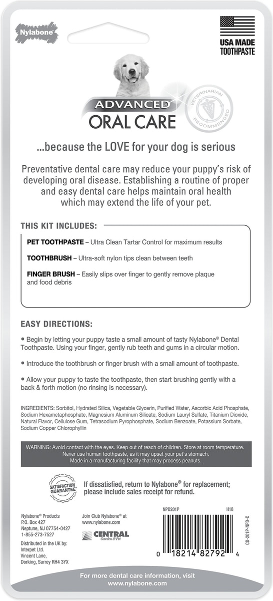 Nylabone Advanced Oral Care toothpaste and toothbrushes are specifically designed for dogs and cats. Regular teeth brushing helps decrease the risk of serious issues in dogs and cats and promote your pet's overall health. Angled bristles help clean even those hard-to-reach places while the flavored toothpaste will make cleaning your four-legged family's teeth simple and rewarding.