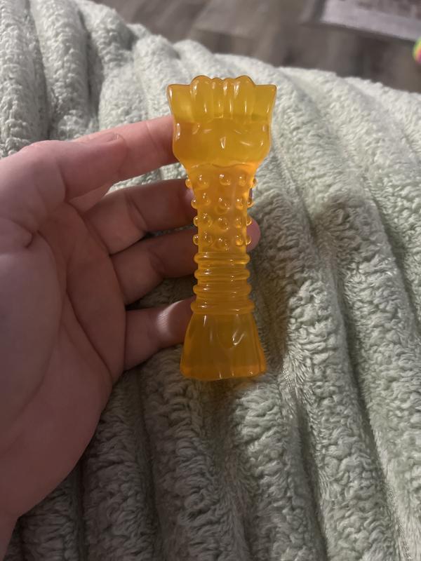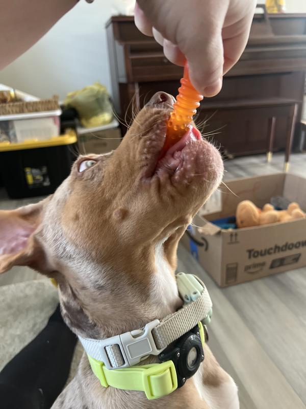 This toy can be put in your freezer to provide long-lasting entertainment that is perfect for teething puppies. The bone features color-changing soft material (turns orange when frozen) with soft bristles that help soothe gums for an improved teething experience.