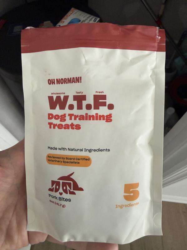 As the proud owner of a rambunctious two-year-old German Shepherd named Max, I've tried my fair share of dog treats over the years. From bland kibble bits to overly chewy jerky strips, nothing quite hits the mark like the W.T.F. Dog Training Treats in the Pork Bites flavor. This bag of 6 oz (141.7 g) goodness has become our go-to for everything from basic obedience drills to those high-energy fetch sessions in the backyard. Reviewed and certified by board-certified veterinary specialists, these treats are made with natural ingredients that align perfectly with my commitment to wholesome nutrition for my big boy. And let me tell you, Max's enthusiastic tail-wags every time I reach for this red-and-white pouch are proof enough that we've struck gold. What sets these Pork Bites apart is their irresistible appeal to a powerful breed like a German Shepherd. Max, tipping the scales at 85 pounds, has a voracious appetite and a discerning palate—he's not one to settle for just any snack. These treats are small, bite-sized morsels that make training seamless; I can dole them out one at a time without spoiling his dinner. The pork flavor is rich and savory, drawing out that focused "what's my next command?" stare that every Shepherd owner dreams of during recall practice or heel work. We've seen remarkable progress in just a few weeks: Max now masters complex tricks like "spin" and "crawl" with minimal distraction, all thanks to the high-value reward these provide. The "Oh Norman!" branding adds a fun, cheeky vibe to our routine—it's like the treats are winking at us, saying, "Your dog's about to wow you." One of our favorite quirks with these treats? Max absolutely adores them cold. We keep the entire bag in the refrigerator right after opening, and it seems to amplify that fresh, meaty aroma he goes nuts for. Chilled, they become even more enticing, turning a simple sit-stay session into a full-on excitement fest. The cool temperature also makes them a refreshing treat on hot summer days, helping Max stay cool while we train under the afternoon sun. It's these little personal touches that make W.T.F. feel like a treat designed with real dogs (and their quirky preferences) in mind. No artificial additives here—just pure, natural pork goodness that keeps his coat shiny and his energy levels steady. Of course, as with any premium product, there's a nod to the practical side. For a larger dog like Max, these Pork Bites can feel a tad pricey for daily indulgence; a 6 oz bag vanishes quicker than you'd think during intensive training marathons. At around $10-12 per pouch (depending on where you snag it), it's an investment best reserved for high-reward moments rather than free-feeding. That said, for smaller breeds or pups in lighter training phases, they're an absolute steal—longer-lasting and more economical, stretching that bag over weeks of consistent use. The compact size and resealable pouch ensure freshness, minimizing waste and maximizing value no matter your dog's build. In a sea of generic treats that leave your pup uninterested or your wallet lighter without results, W.T.F. Dog Training Treats – Pork Bites stand tall as a five-star essential. They've transformed our bond with Max, making every session joyful and effective. If you're training a German Shepherd or any working breed, grab a bag, pop it in the fridge, and watch the magic unfold. Your dog will thank you—with sloppy kisses and flawless obedience. Highly recommended