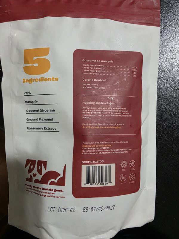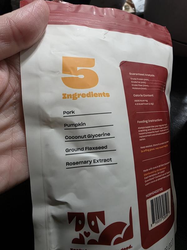 Oh Norman WTF not only has a fun name, it’s a very good product! Made with only 5 ingredients, it’s an incredibly tasty natural product that my 15 pound Schiperke mix 14 year old dog absolutely loves. He’s on a limited diet and this fits perfectly into his treat-oriented lifestyle while still being healthy. I hope you develop even more flavors!
