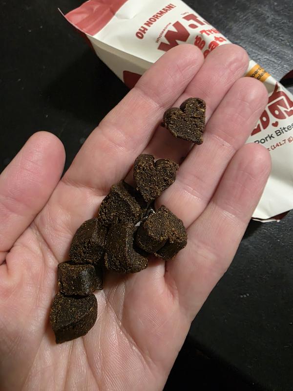 These are great! I trust this brand for clean and simple ingredients and this one delivers too! The scent is very light ( unlike other treats that smell strong). Harry is happy when he hears the bag open and comes running for his WTF pork treats. I highly recommend these! It’s fun trying new things for our furry family members!