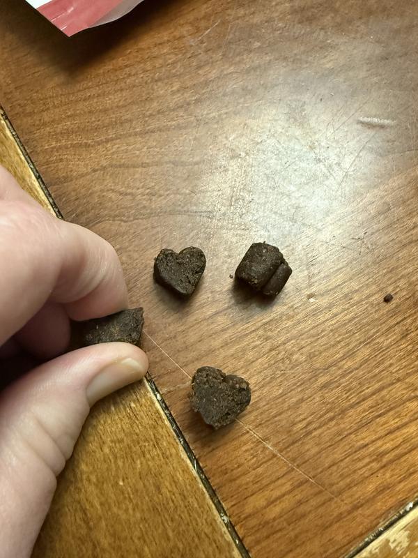 This treat is small and chewy and my boxer dog loves them!! They are great for training or an everyday treat. There are only a few ingredients which makes me happy she is not getting a bunch of fillers.