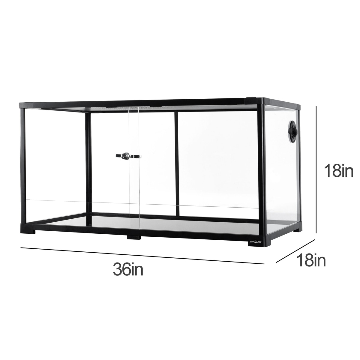 - Tempered glass reptile terrarium features sliding front doors for easy access for feeding and cleanup.