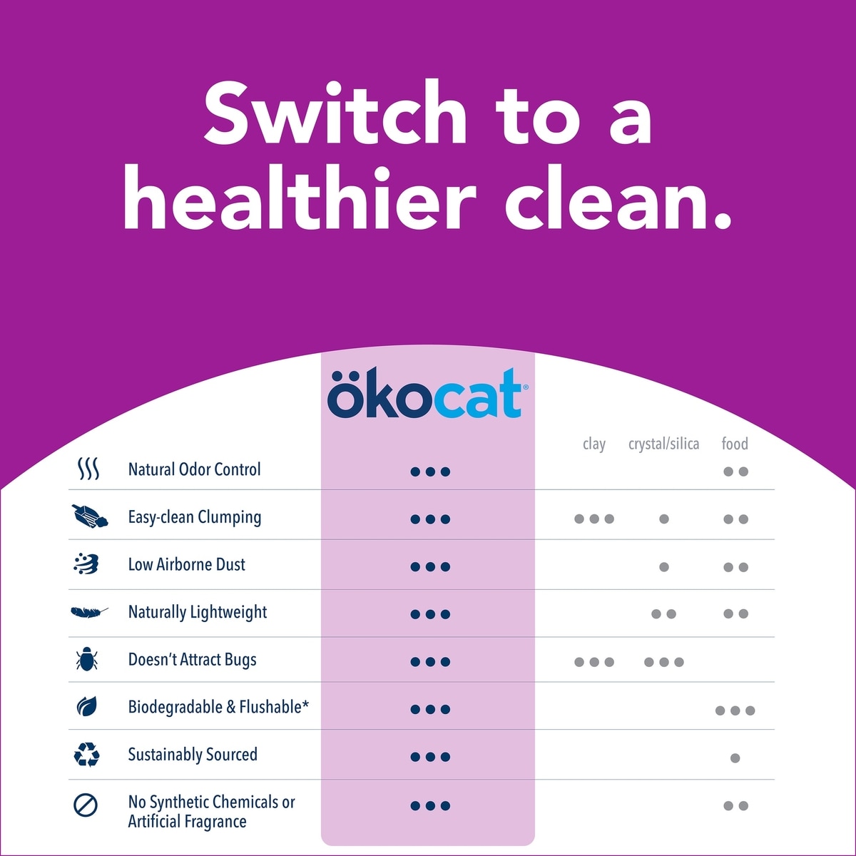 Wherever your cat roams, litter tracked by paws inevitably follows. Free of artificial fragrance, harmful chemicals, and toxic dyes, Okocat natural cat litter lets you keep clay dust out of your home and off floors, counters, and furniture.