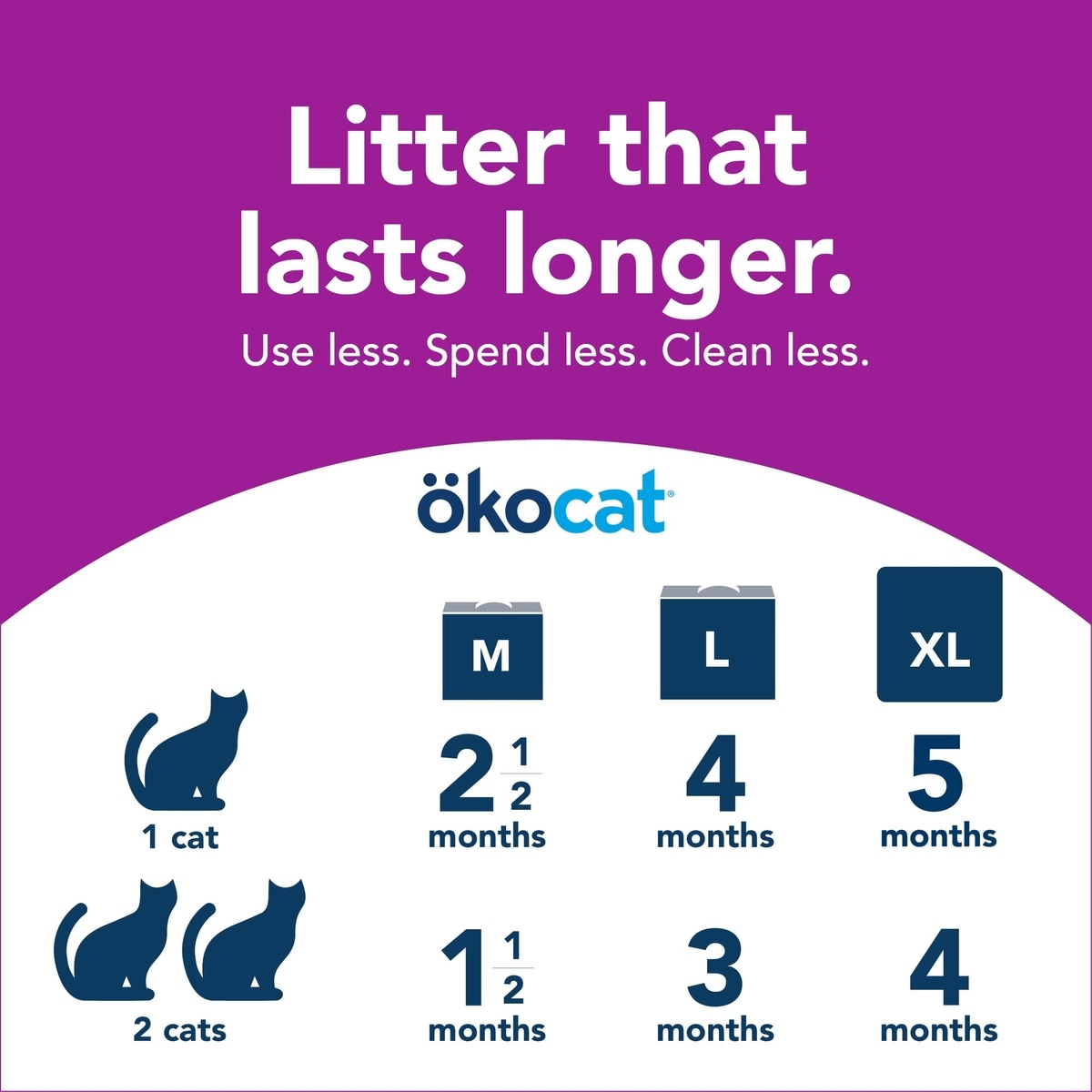 With regular scooping, Okocat litters can last up to 7 weeks for one cat. Plus, the Low Tracking variety is designed to stay in the litter box, preserving it for use while keeping your home tidy. It’s litter that lasts longer—in more ways than one.
