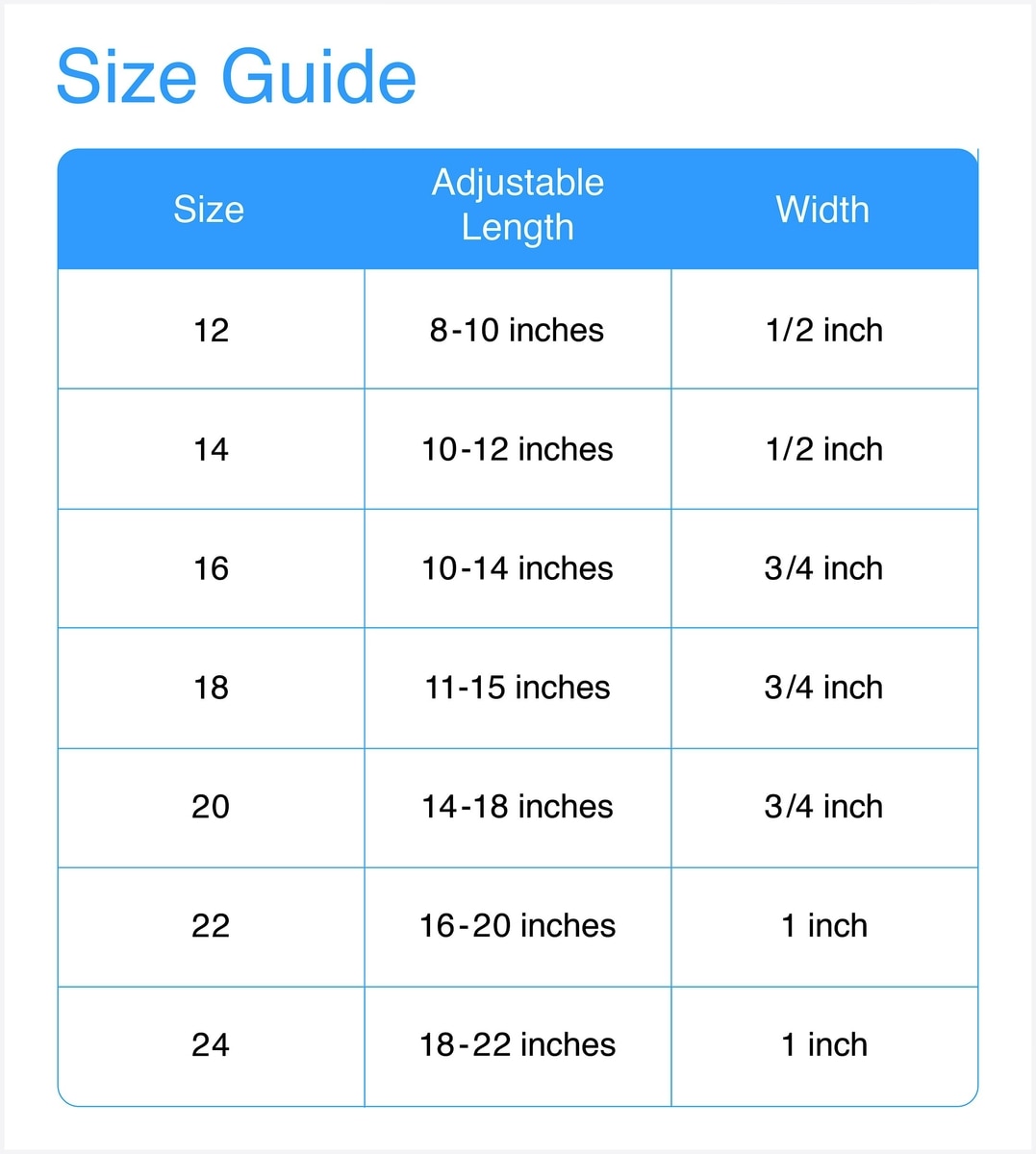 The 12-in and 14-in collars have a ½ inch width. The 16-in, 18-in, and 20-in collars have a ¾ inch width. The 22-in and 24-in collars have a 1 inch width.