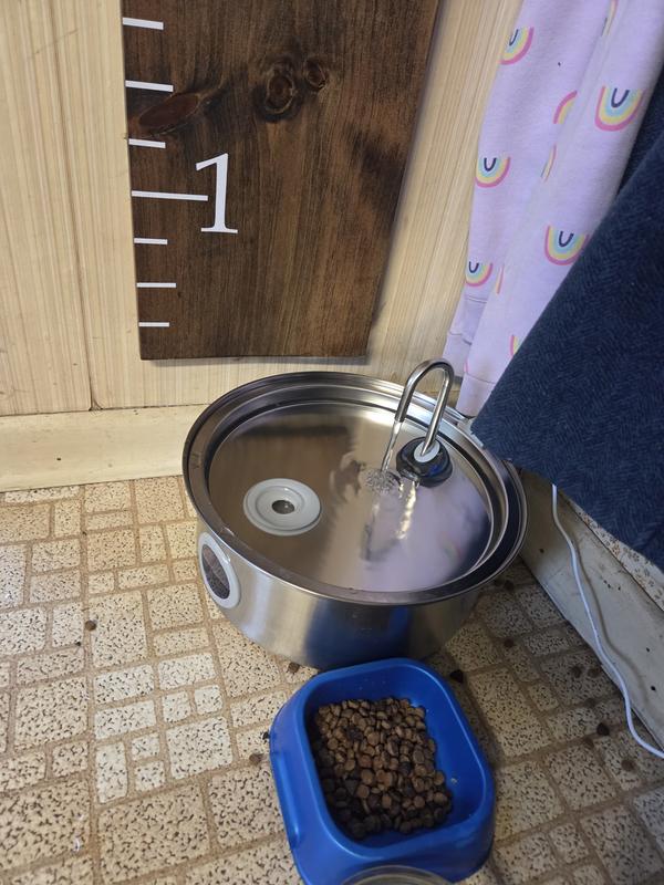 My senior mini schnauzer and puppy mini sheepadoodle love this fountain. I was afraid they would not like but both prefer it to their old water bowls. It is a good height for both dogs.It is an attractive stainless steel bowl. Keeps water fresh and filters out all debris. It holds plenty of water for both dogs and has a gauge on side to show you the water level so you will know when you need to add more water. I wish the plug in cord was a couple of feet longer for the spot I have it in, but i made it work.