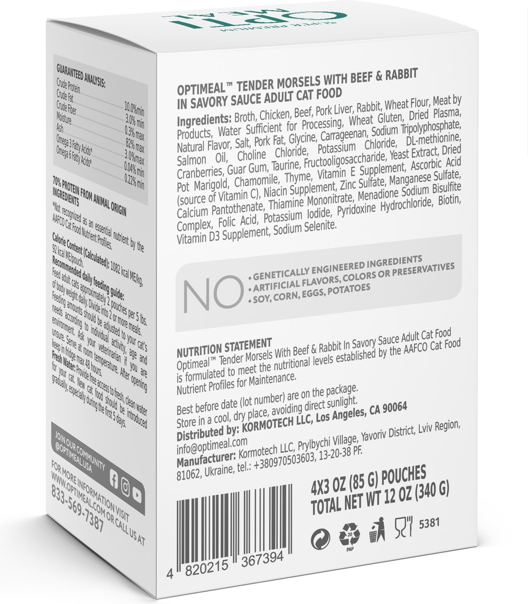 Optimeal Tender Morsels with Beef & Rabbit In Savory Sauce Recipe Wet Cat Food, 3-oz pouch, case of 24