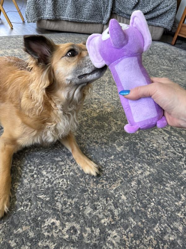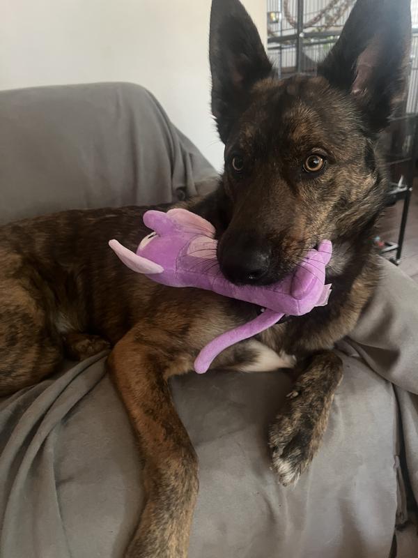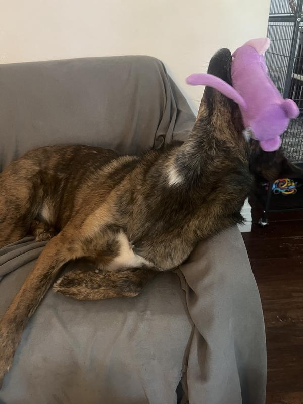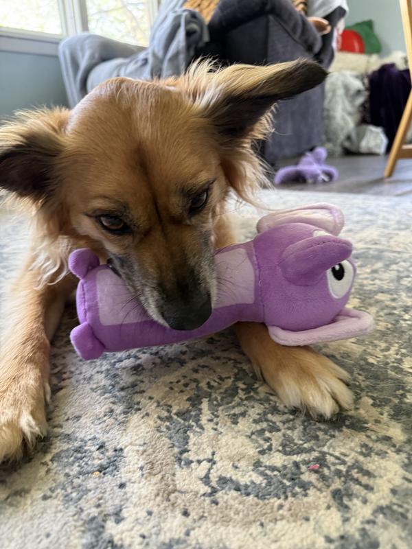 All 3 dogs LOVE this toy!! It is cute, just the right size, and durable. They have not been able to get it open to get the stuffing out, despite chewing on it a lot! They absolutely love the squeaky and especially the crinkle of the plastic “water bottle” They take turns carrying it around and spend a lot of time chewing on it to hear the crinkle or squeak. They have a lot of toys and this one immediately became a favorite. And, it is a pretty purple and has a cute elephant head, and is just plain adorable.