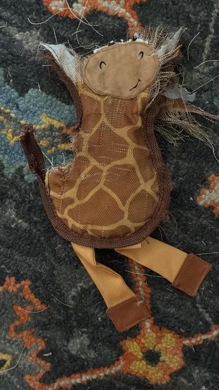 Darla set to work immediately on this one. Killed the squeaky right away, then disemboweled it. Remy tried to save it, but it was too late. The giraffe was dea