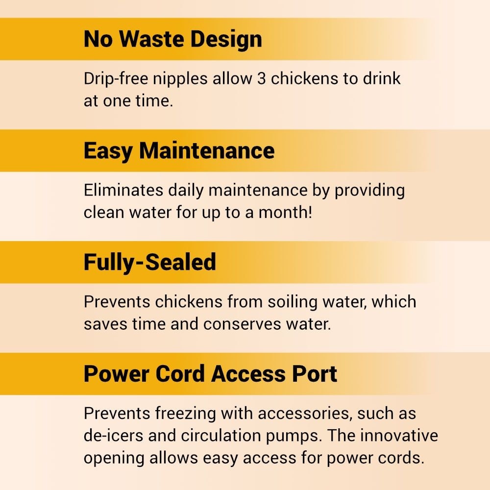 This Poultry Waterer features an access port opening that provides easy access for power cords from optional accessories that are sold separately.