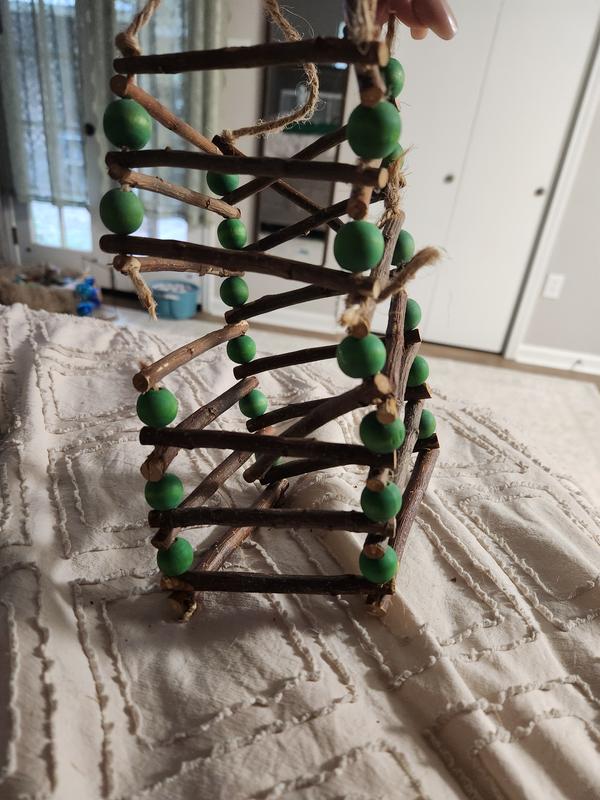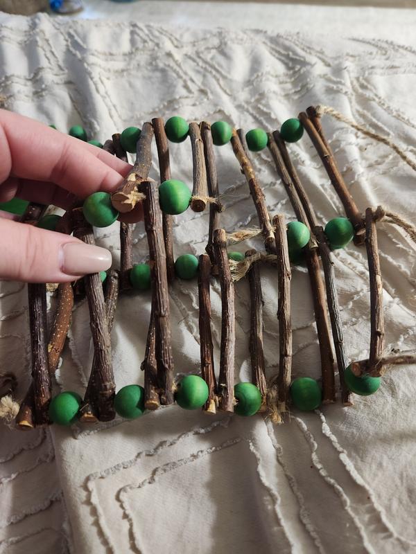 The green bottom and top pieces of wood feature an indentation that helps them fit into place on the twig railing.