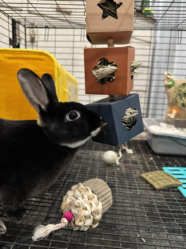 This toy is designed for chinchillas, guinea pigs, and rabbits.