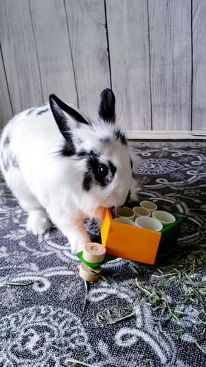 My bunny loves to toss this around in order to get his treats. He pulls out the cubes and tosses them into the air, then attacks the house and chews on it. I love that it's made with safe materials to chew on. Great interactive toy to keep your furbabies busy.