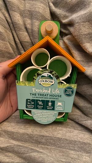 The treat house is great my little guinea likes to take out all the white tubes and chew on them after getting the treats, so you may have to replace them eventually with other safe cardboard circular holders. The only concern is the construction of the green panel with the wooden screw. It was already showing fracture lines on the thin wood piece, so just needs to be a little thicker. Other than that my sweet girl is having fun with it.