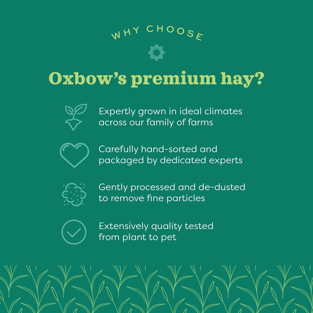 For Oxbow, quality products begin in the field. Oxbow has spent years cultivating relationships and educating its growers about the proper way to nurture and harvest hay specifically for small pets. Then, using an exclusive process, Oxbow hay is inspected, graded, cleaned and sorted to ensure only the best hay is packaged under the Oxbow name.
