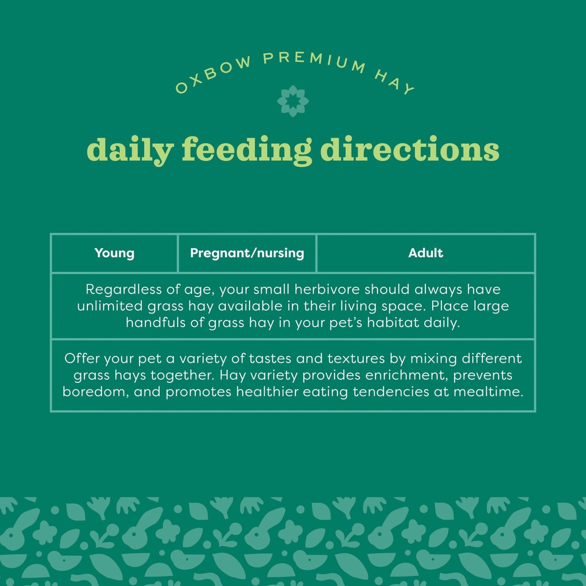 This hay can be fed to all life stages of small animals. For growing and mature animals, feed unlimited amounts.