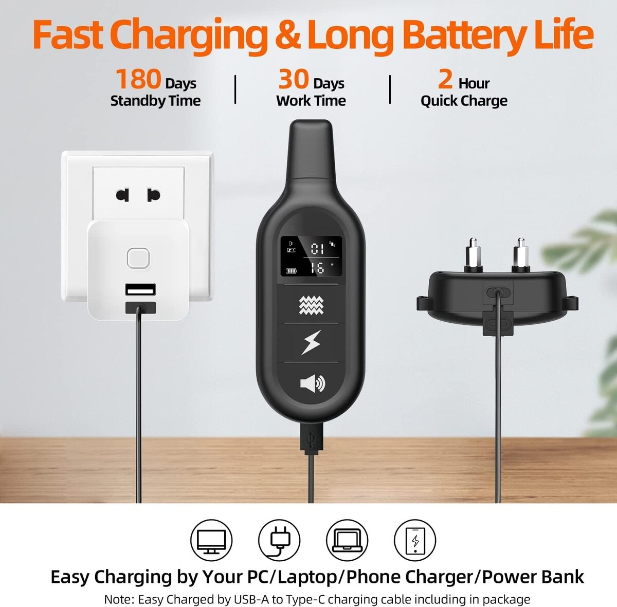 • Features 3 humane training modes—beep, vibration, and adjustable safe shock.