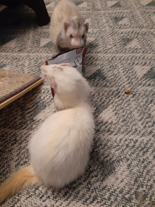 This is one of the rare snacks that our ferrets are willing to eat. The small cubes are described as “stash safe” as they seem to last a long while when given as is. One of our ferrets immediately stashed his.