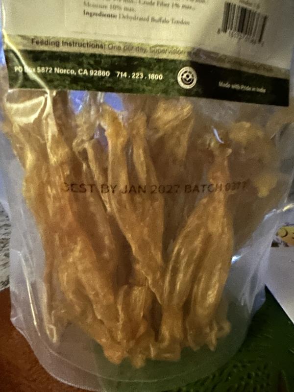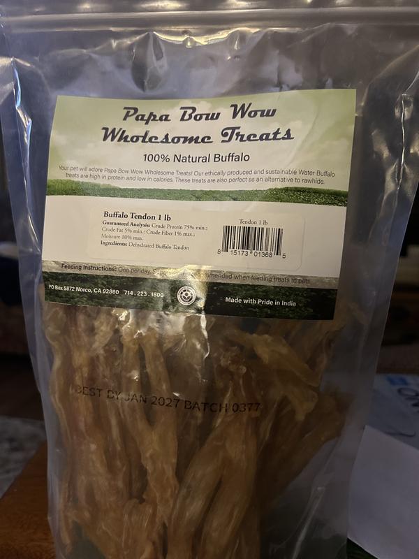 So, our Papa Bow Wow Buffalo treats came in a clear plain bag with a simple label- nothing fancy. It does say made with pride in India- I’m a little disappointed it’s not made in the USA. But - both my chihuahuas absolutely luv these! I have one that eats it very methodically, but the other tries to devour it whole- and really needs to be watched closely. They actually fight over them ! Thankfully , there are no noted digestive issues so far. These tendons do have an odor- when wet and dry, but leave no residual stains. There are a lot in a one pound bag - and each are a good size. As I said, both dogs get really excited when I bring out the bag - but I give them out sporadically as “ Special” treats - due to their size .