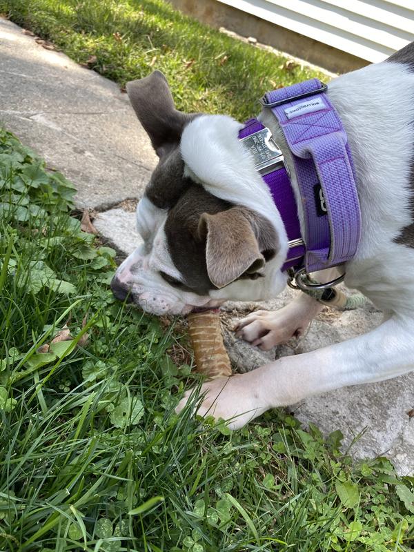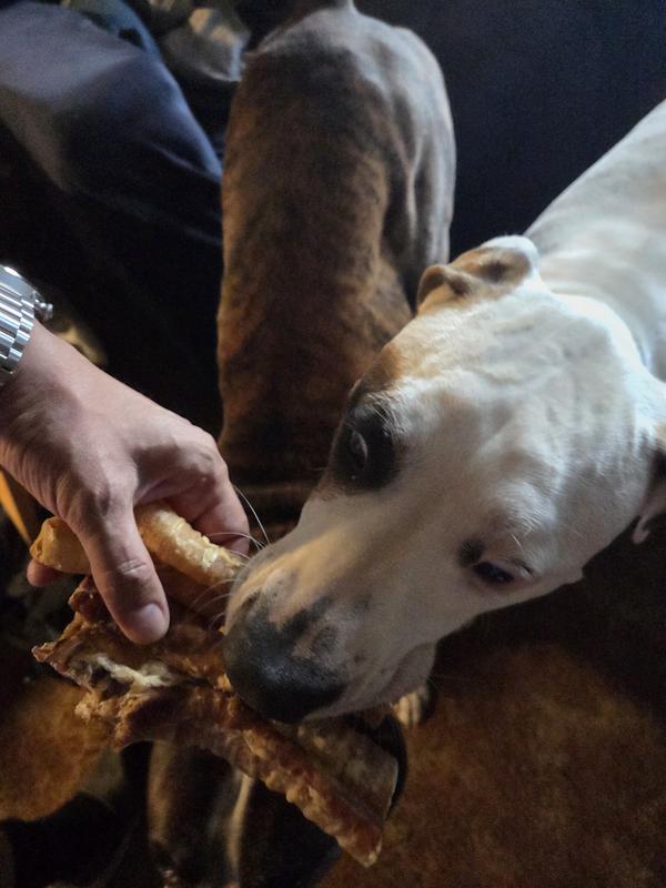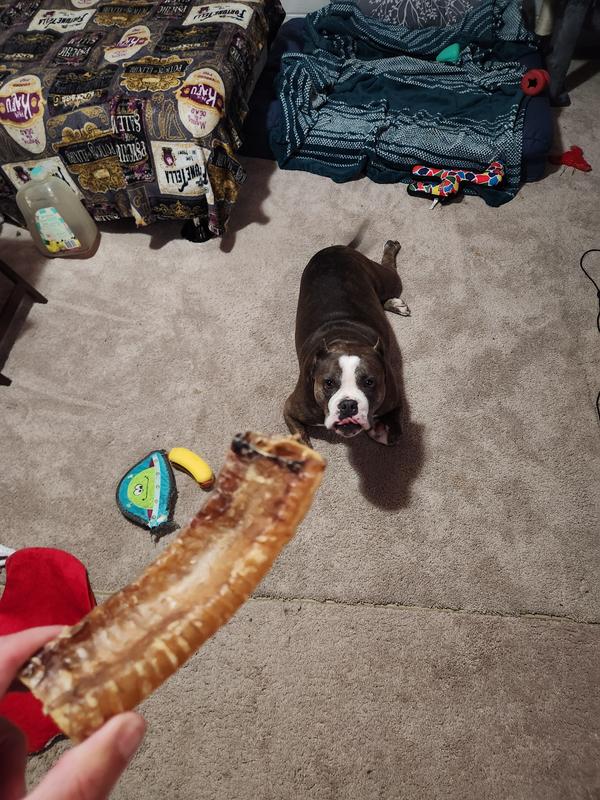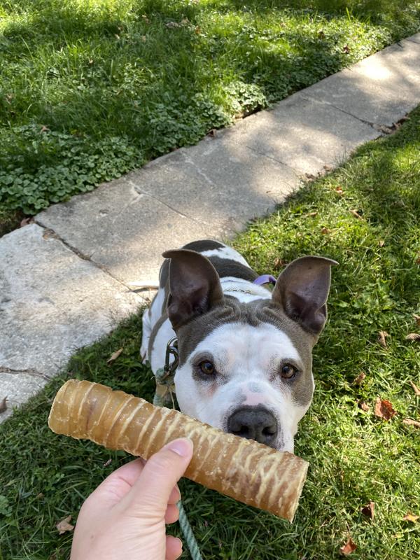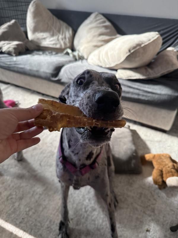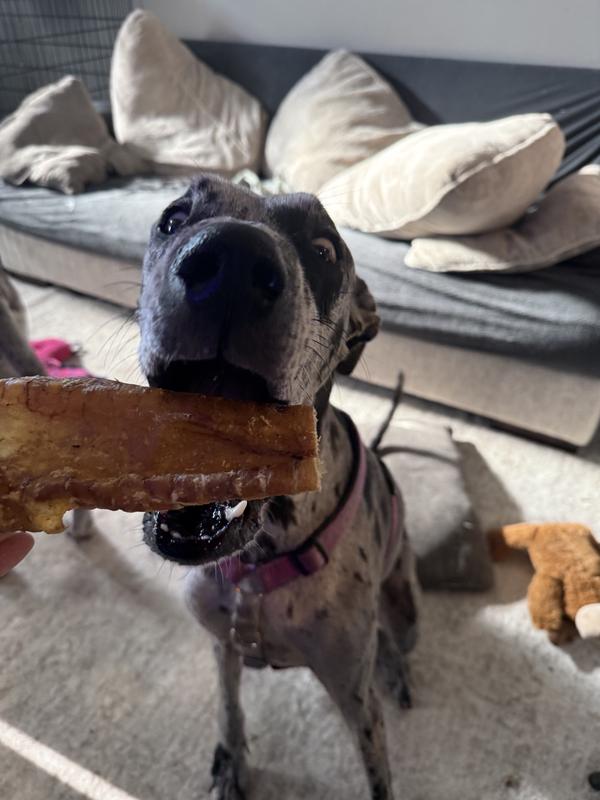 Our baby girl (7 year old pittie/bulldog mix) always ends her night with something to keep her busy while we eat dinner. Unfortunately, she is a champion chewer so we try to find things that will last at least 30 min and this is a winner! 1) Not smelly! Neutral and only a little oily feeling when you pull them from the bag. 2) Size is perfect for medium-large dogs. 3) Keeps her busy long enough for me to eat my pasta. 4) Easy on the tummy. She has a pretty sensitive stomach and these have given her 0 trouble!