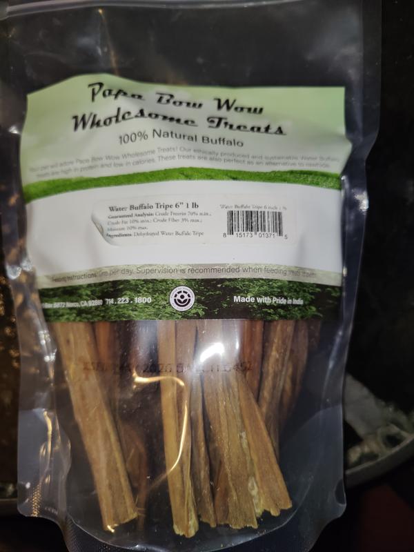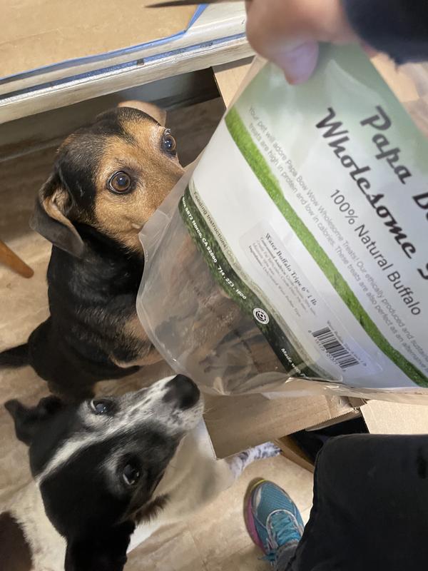 I am always looking for new treats to keep my super chewer pup busy. These work great for keeping him focused on something for a little while. I love how it is 100% natural buffalo so I know I'm giving him a healthy treat. I love this large bag (1 lb) with plenty of treats and able to close the bag at the top. I do not give rawhide for safety reasons so this is a great alternative. It does have a strong odor but that is expected with this type of item. I just let him be on the other side of the room and everyone is happy.