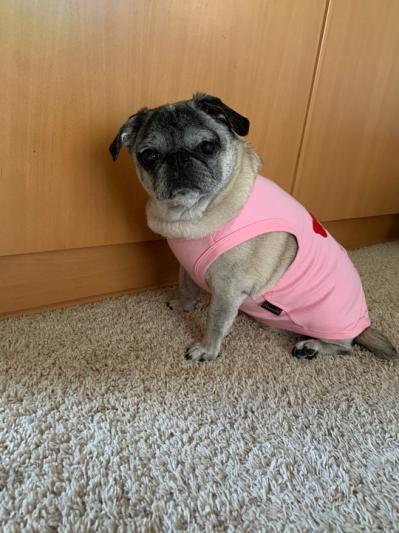 It’s really hard to find things that fit my petite pug. This fits her perfectly and it was also perfect to announce she was going to be a big sister! For reference she is about 18 pounds (a little over weight) but quite petite. Usually she wears a s/m but I followed the sizing chart (definitely recommend) and I got a size xl for her.