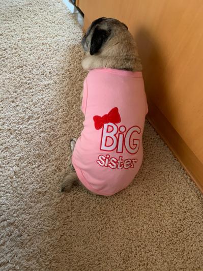 It’s really hard to find things that fit my petite pug. This fits her perfectly and it was also perfect to announce she was going to be a big sister! For reference