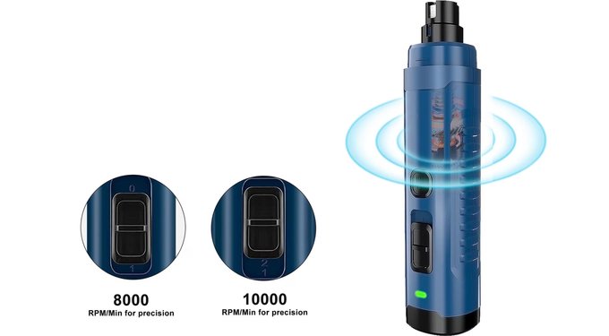 The Patpet nail grinder features a superior motor for quiet and comfortable trimming. Start with a low speed at first, then try higher speeds as your pet gets used to the grinder. The higher speeds can accommodate pets with thick or larger nails.