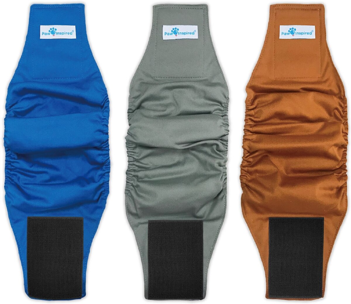 Paw Inspired Reusable Male Wraps feature a stretchy elastic band and breathable bottom layers to keep your pet comfy and secure. These washable belly bands are also equipped with strong hook-and-loop fasteners that you can reposition so your pet stays comfortable and the wrap stays put. Available in multiple sizes, including XS, small, medium, large, and XL, they come in various colors with white or black lining options, so you can choose what works best for your pet.