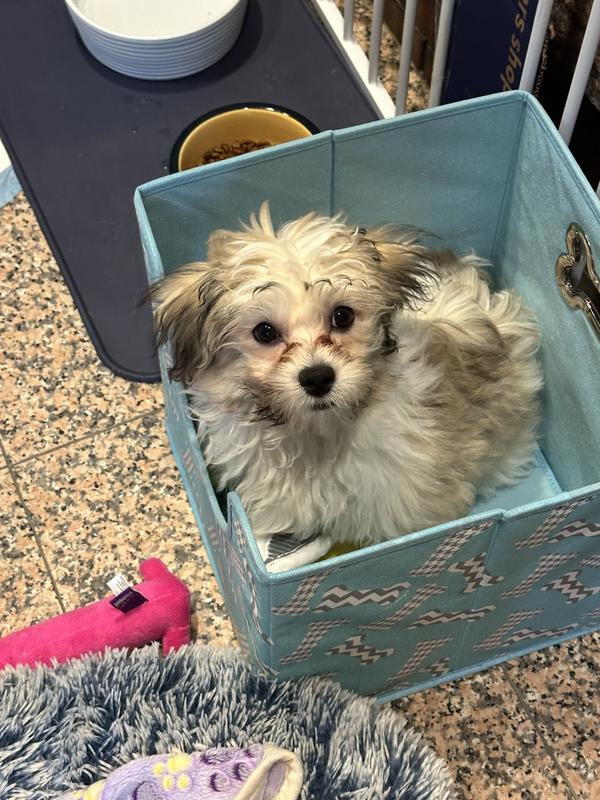 Milestone today. Puppy figured out the opening today and 'stole' his toys back from mean mama that piles them in this horrible box! He has been watching me play