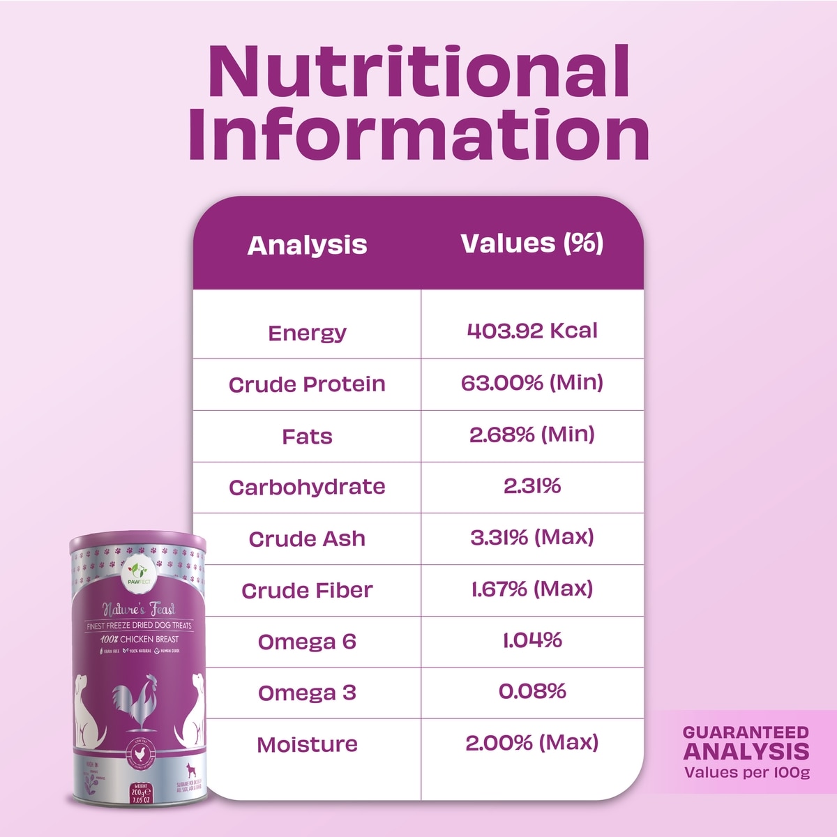 - Freeze-dried chicken breast treats are high in protein to support optimal health.