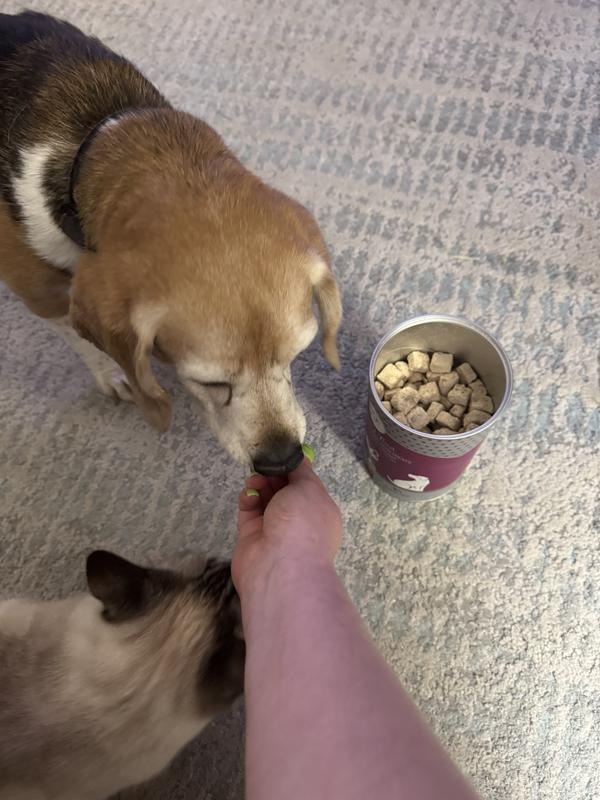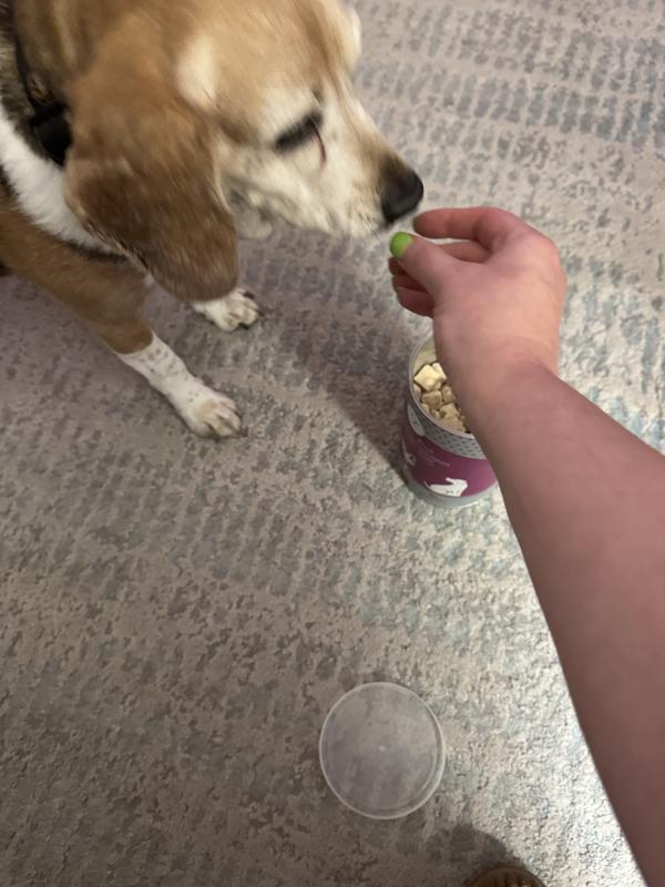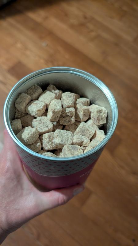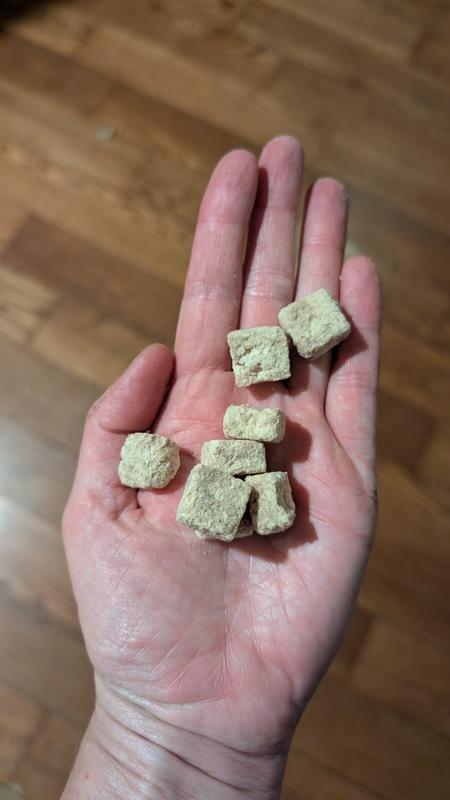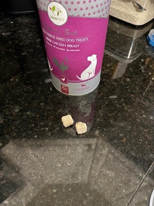 I was pleasantly surprised when I received this product that it wasn’t like any other freeze dried chicken product that I’ve seen before. All of the pieces are symmetrical and in little squares. They seem to like any other freeze dried chicken. I have a 70 pound goldendoodle and a 15 pound Havanese. The golden doodle sucked these down Like they were candy. They Havanese ran hot and cold with these. I don’t know why. She’s usually not a picky dog. I have to think these chicken treats are good, she’s just weird. I liked the fact that they came in a cylindrical container. I like that they are little square treats. They feel light and crunchy. They are definitely a big hit with my one dog. They are a semi hit with the other one. I am very pleased with this product.