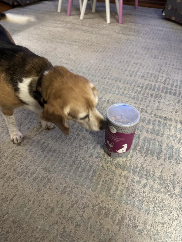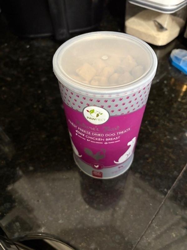 This is a really great treat. The canister keeps the product fresh and is easy to open and close. My dog absolutely loves the flavor. It is 100% pure chicken breast!