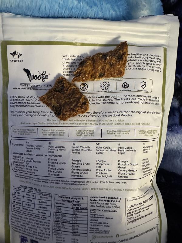 What are the benefits of each Woofur variant? Each variant combines chicken with fruits or vegetables to deliver specific health benefits: Gourmet Chicken: A high-protein treat that supports muscle health. Chicken and Cranberry: Rich in antioxidants to support urinary tract health. Chicken and Carrot: Packed with beta-carotene for vision and immune health. Chicken and Pumpkin: High in fiber for healthy digestion. Chicken and Banana: Provides potassium and energy for active pets. Chicken and Apple: A source of vitamins and antioxidants for overall wellness. Chicken and Ginger: Helps soothe the stomach and supports digestion. Chicken and Sweet Potato: High in fiber and a great source of energy. Chicken and Coconut: Contains healthy fats for a shiny coat and skin health. Chicken and Blueberry: Loaded with antioxidants for brain and immune health. Chicken Liver: A nutrient-dense treat packed with vitamins A and B. Chicken and Beetroot: Supports blood circulation and boosts stamina. Chicken and Mango: A natural source of vitamins A and C for skin and immune support.