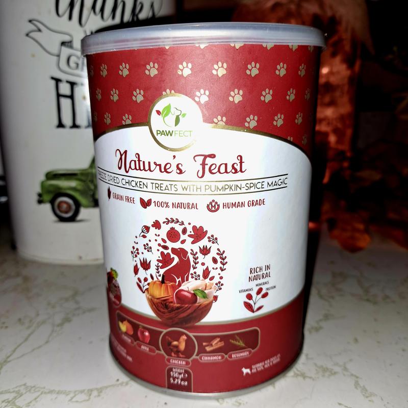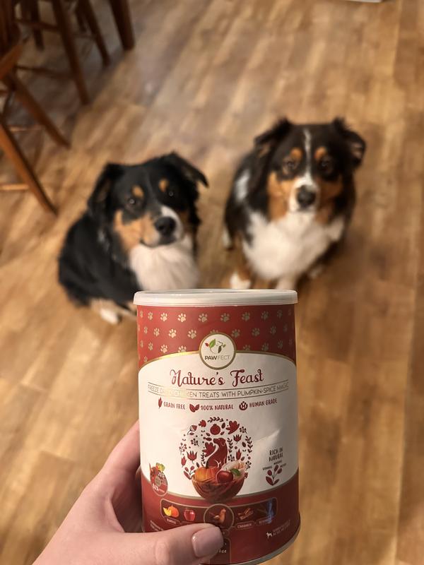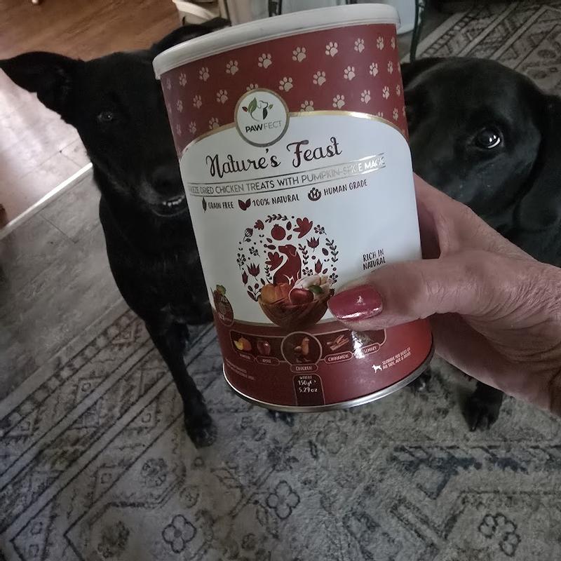 I'm very pleased with Pawfect Nature's Feast chicken with pumpkin spice treats. The treat container was appropriately sized , easy to open and provided a reliable seal. The treats have all-natural, freeze-dried ingredients which is a big plus for me. Each treat was generously sized and light and airy with a delicate crisp. Actually, they remind me of a puff chip. The treats sparked excitement in not only my dog Bailey but also my cats. All were begging for a taste after the container was opened. Bailey was thrilled with the treats and could not get enough. I allowed each of my cats to try a treat and received the same reaction as Bailey's. All were thrilled. The treats were a big hit but there was a considerable amount of crumb dust in the container. Perhaps future packaging could aim to minimize the amount of crumb dust found in the container. Overall, a very positive experience with the treats. We will definitely buy the treats again and wholeheartedly recommend dog owners trying these treats.