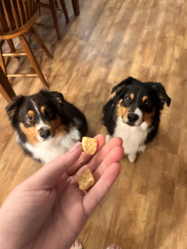 Used these treats with my two aussies and they enjoyed them. They are small and compact which makes great for training treats and they seemed to enjoy the taste
