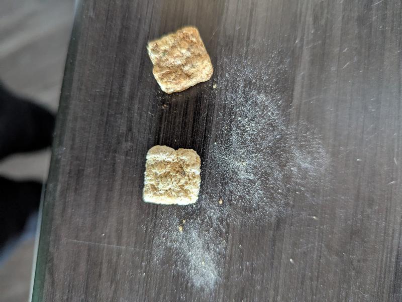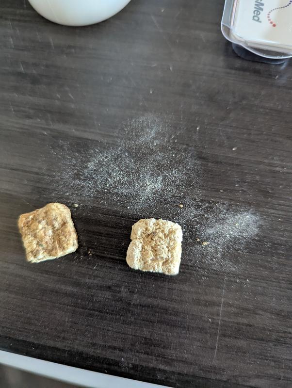 These dehydrated treats are easily broken in pieces and my dogs loved the taste. Even the oldest dog with bad teeth will have no problem eating these. They will easily break down into a powder. Both dogs did well with no gi upset after eating.