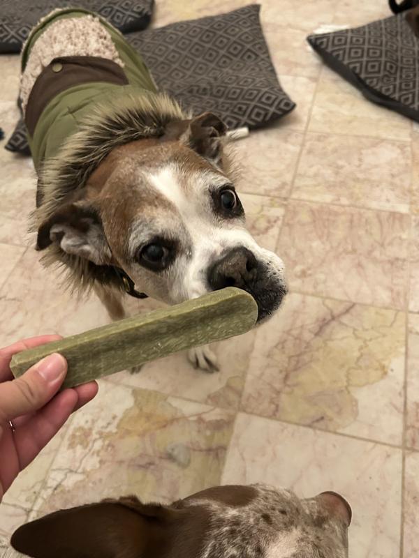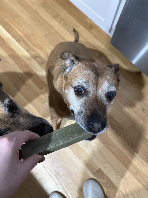 I was excited to try these Dentamust sticks with my 3 dogs, but my excitement turned to disappointment. The sticks are so hard that my 2 older dogs are unable to chew them. I was able to give one to my 3 year old Corgi and he was obsessed with it. I guess I will save the other 2 sticks for when the corgi finally finishes the 1st one, he has had it for days now and will work at it a little at a time.