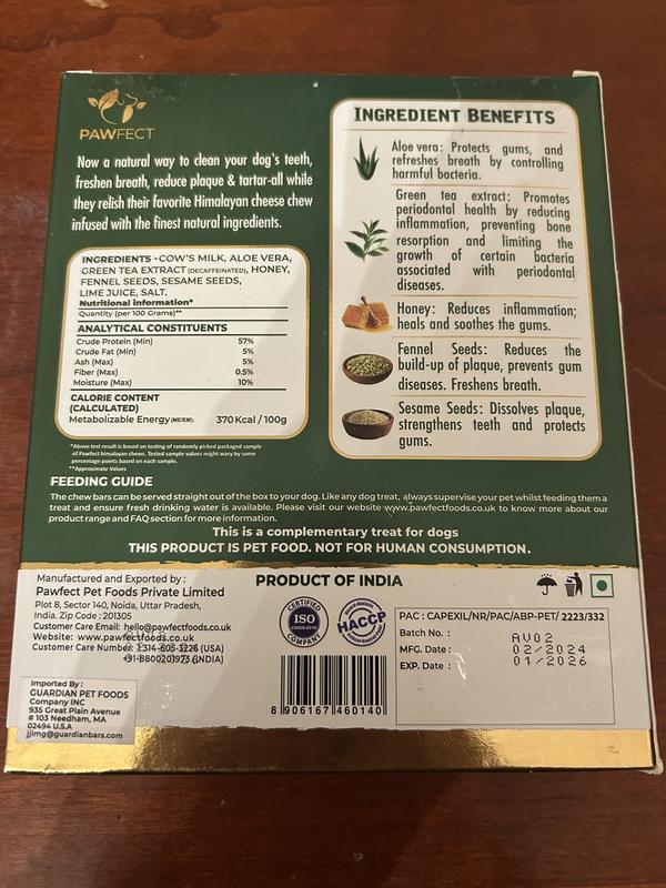 My Hazel absolutely loved Pawfect Dentamust Himalayan Cheese with Aloe Vera Dog Chews. She is a labrador retriever and it took her most of the day to finish this treat. She was obsesse! Kept her busy and freshened her breath. The ingredients are very clean and healthy. I was thrilled with these chews and would highly recommend them. Not only is this treat long lasting, Hazel’s teeth looked clean, and this chew definitely freshened her breath.