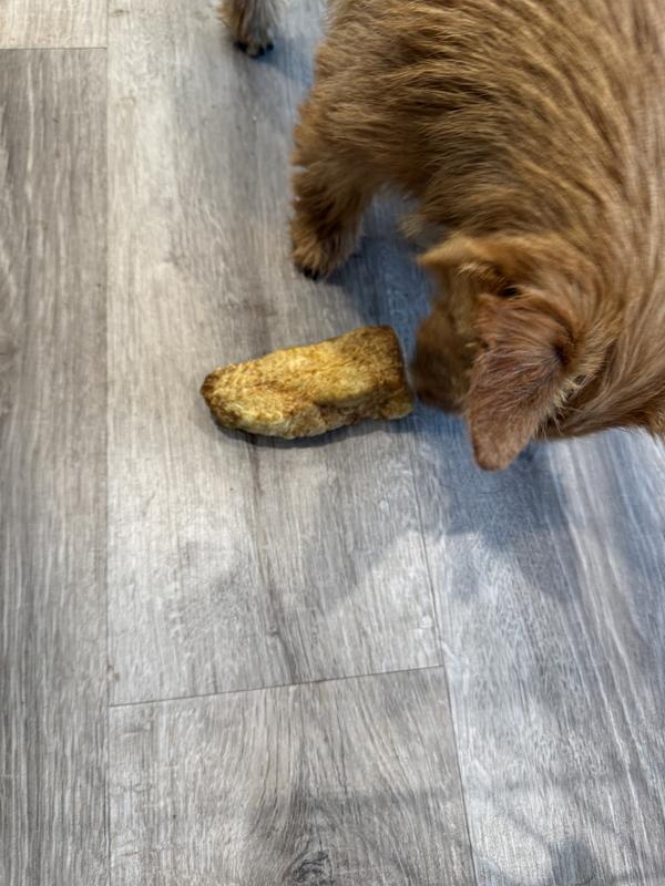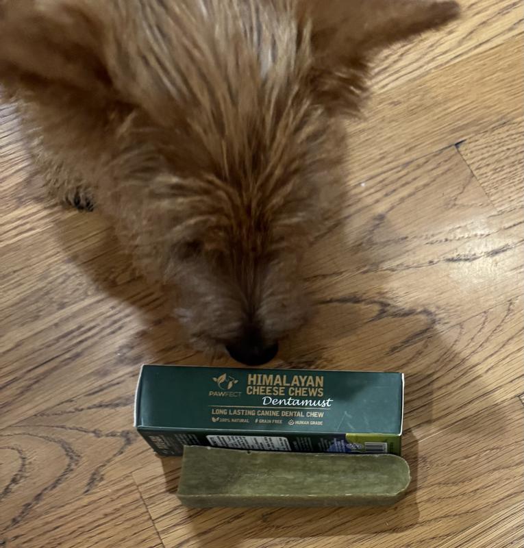 As we opened the package in front of my dog she was very curious because she could smell it. I placed the Himalayan cheese chew stick on the floor next to her. She