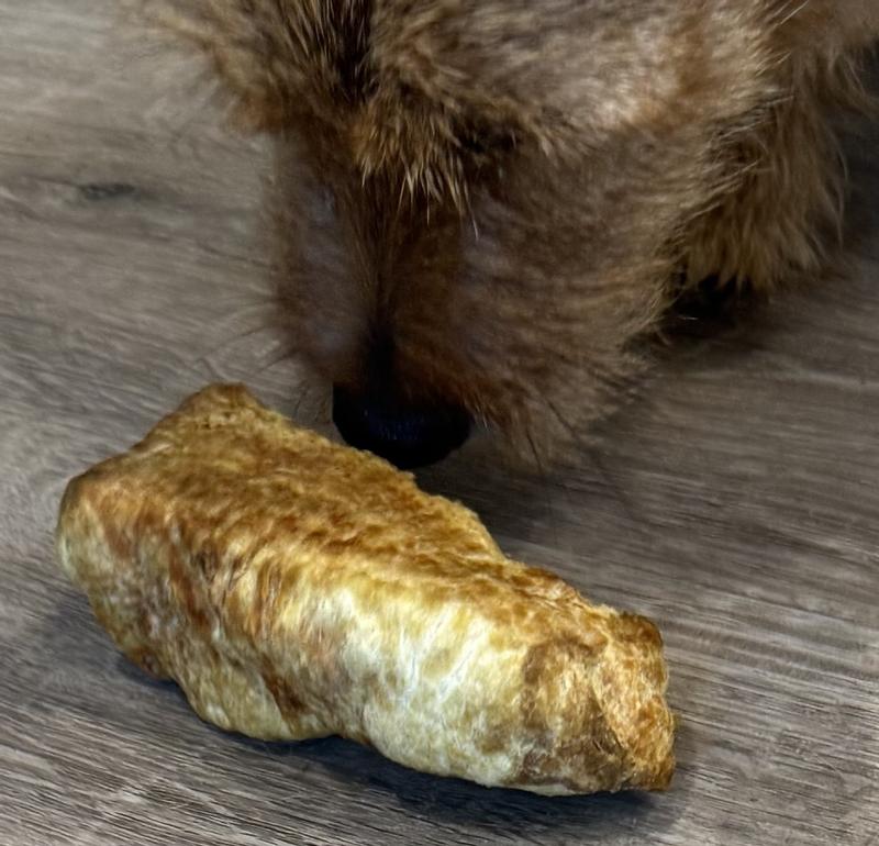 What should I do with small leftover pieces of the chew? You can microwave the small leftover pieces for about 30-45 seconds until they puff up like a crunchy treat. Let them cool before giving them to your dog as a snack!