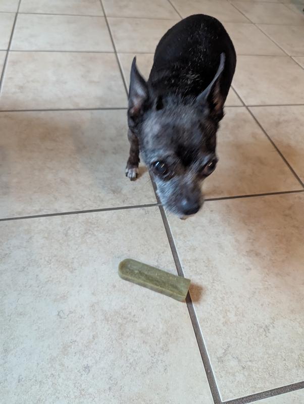 As we opened the package in front of my dog she was very curious because she could smell it. I placed the Himalayan cheese chew stick on the floor next to her. She sniffed it and did seen interested, but it was just too big for her . They may have smaller sizes that I'm not aware of. My dog is a small 7 lb Chihuahua. She couldn't get her mouth around it. A bigger dog would love these! I love that it has all natural ingredients but the size was an issue just because my dog is so small.