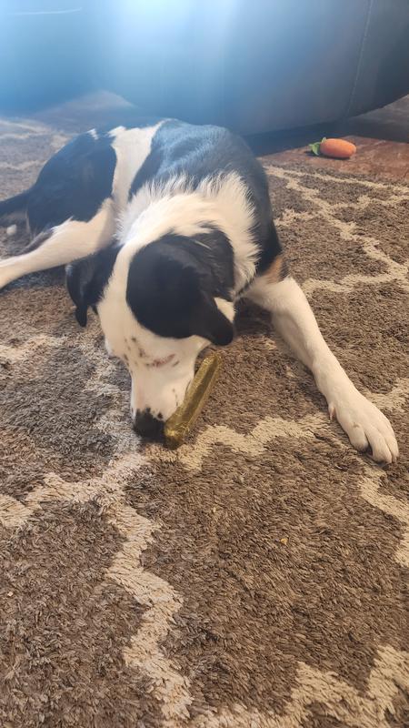 Our dog is 1 years old so he has that playfull puppy energy still. He goes through other chews too quickly so it either upsets his stomach or only occupies him
