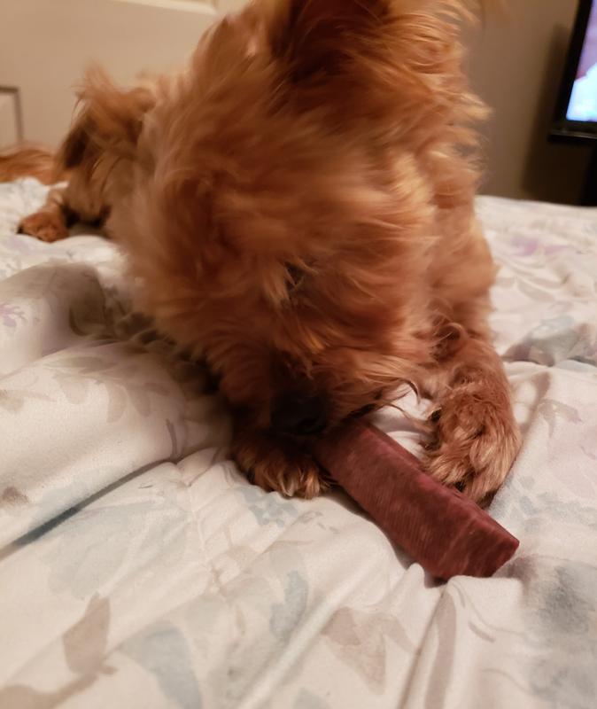 Our puppers is very food motivated. She destroys dental treats in a matter of seconds. This is the first time she’s been working on something for almost 10 minutes now. She seems to really love it. Of course, we’re very careful to keep an eye on her while she has it, but I think this might be a keeper!
