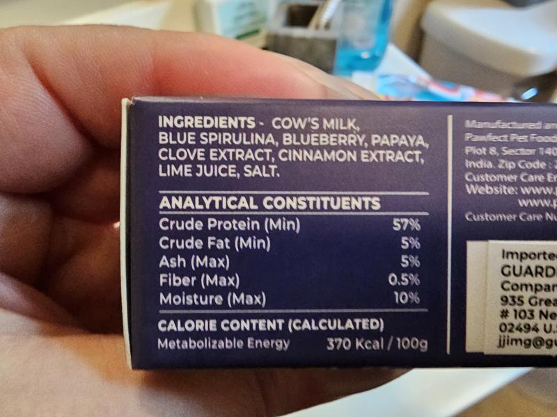 Made with Cow’s Milk, Blue Spirulina, Blueberry, Papaya, Clove Extract, Cinnamon Extract, Lime Juice, Salt.