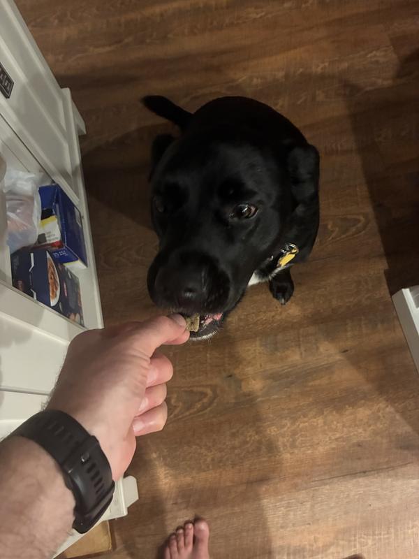 Not his favorite treat. Our poodle did eat a few of these at first but he isn’t excited now. Tried several times but he isn’t interested. Not sure if it’s the flavor or dry texture that he doesn’t like. Will pass along to another dog family so hopefully they will have better results.