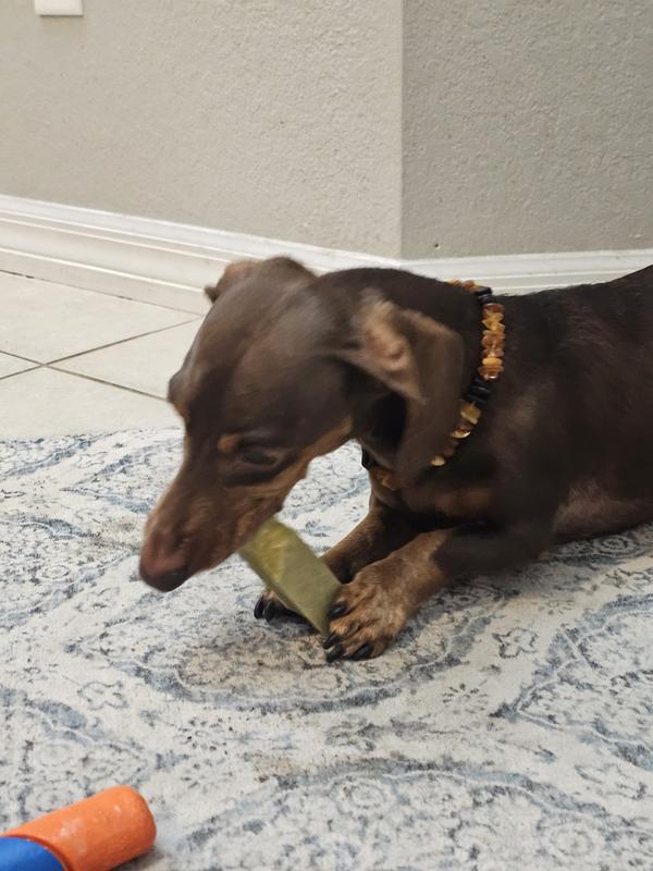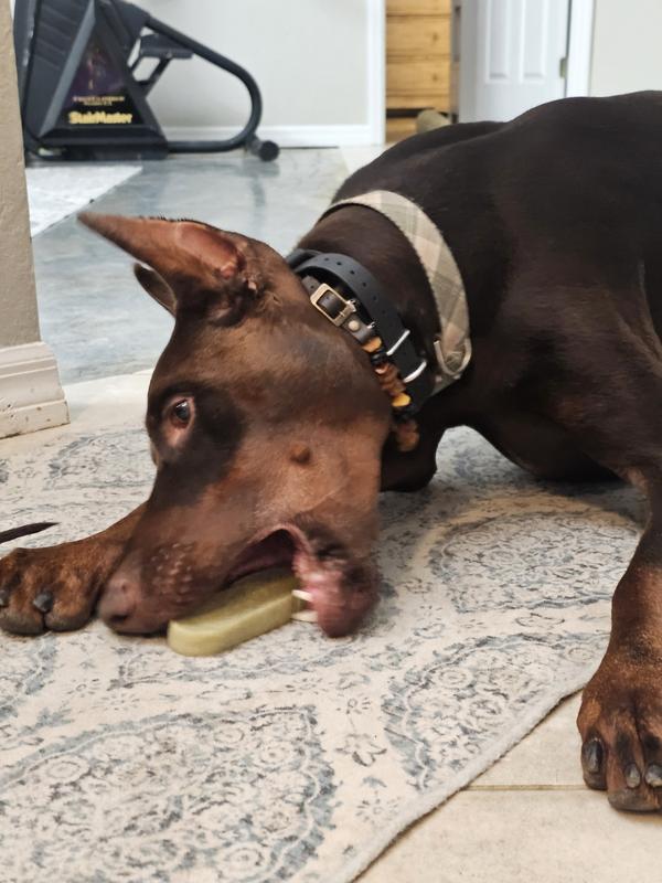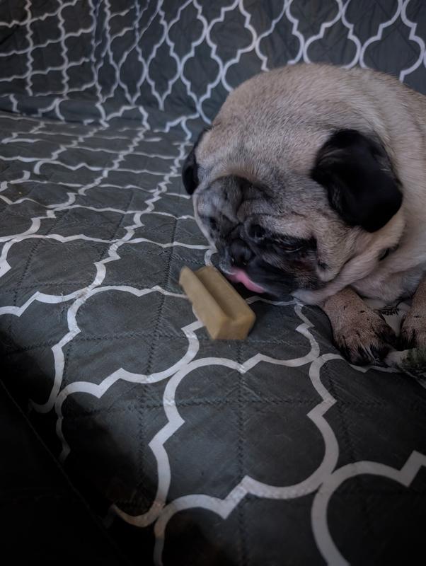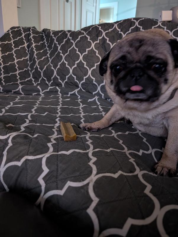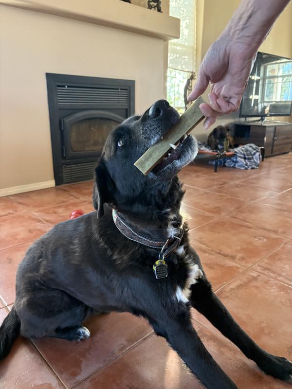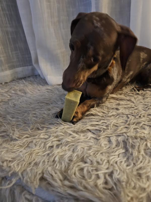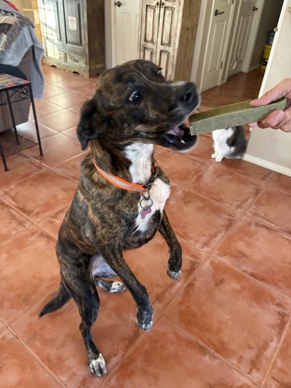 I was pleasantly surprised by how much my senior dog loves these chews and how long they last. Because it is a milk based product, I assumed it would be a softer dental chew but it is really more like the texture of a bone. My dog has been working on the same chew for about three days now and has worn it down to about a third of its original size. The only thing I don’t love about the chew is that it tends to be a bit messy in that the gnawing leaves little crumbs everywhere. Otherwise, this seems to be a hit!