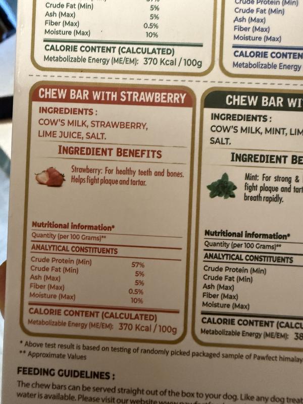 Do they have any other flavour apart from Cheese? Pawfect Himalayan Cheese chews come with fruity flavours, like Blueberry, Cranberry, Aloevera. Other fruit infused variants include Himalayan cheese chews with Strawberry, Mint, Turmeric & Ashvagandha .